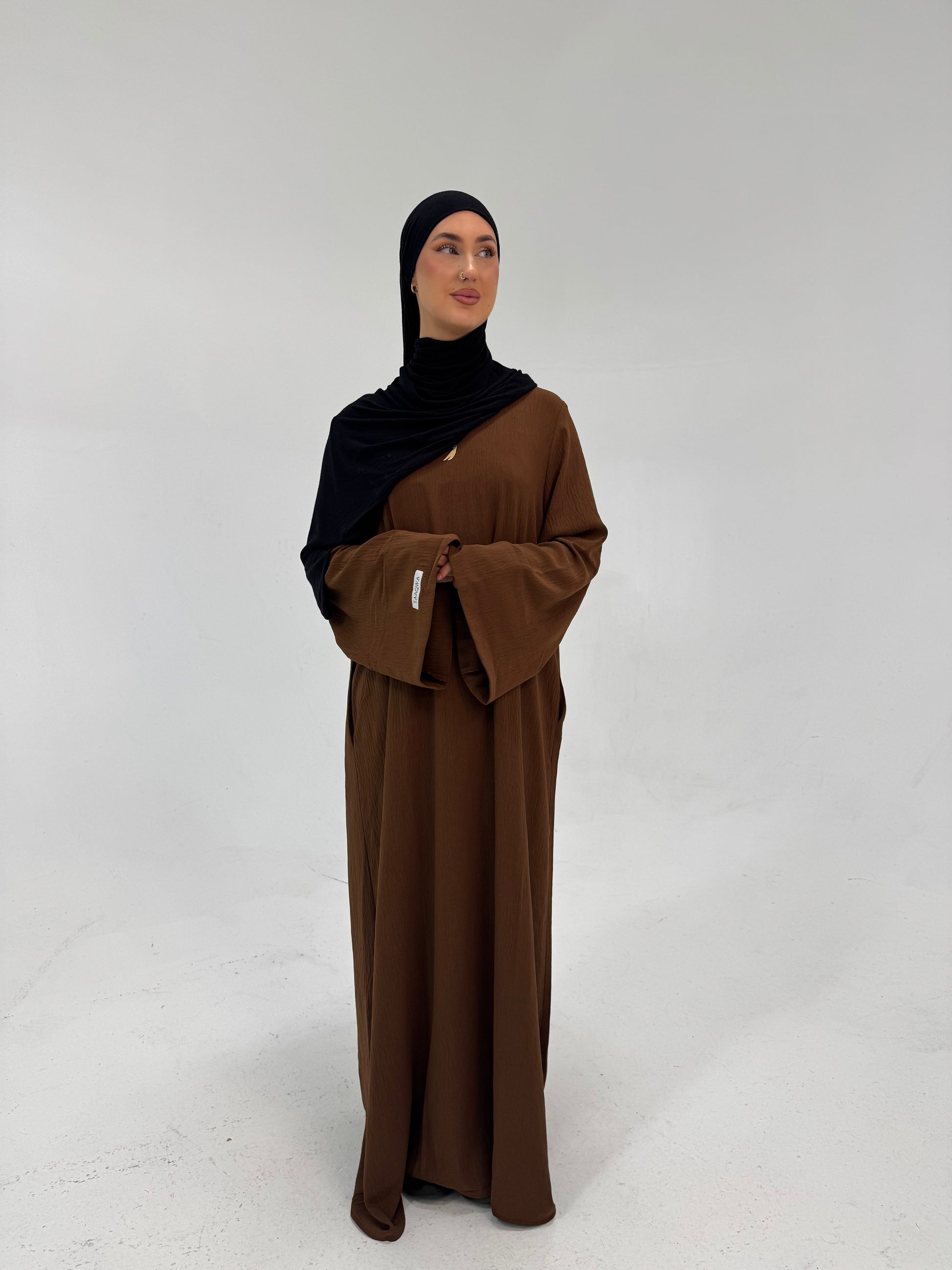 Our abaya made with stretchy jazz fabric, offers both comfort and flexibility. It features convenient pockets and has a unique design with our name on the sleeve, combining practicality with a modern look.