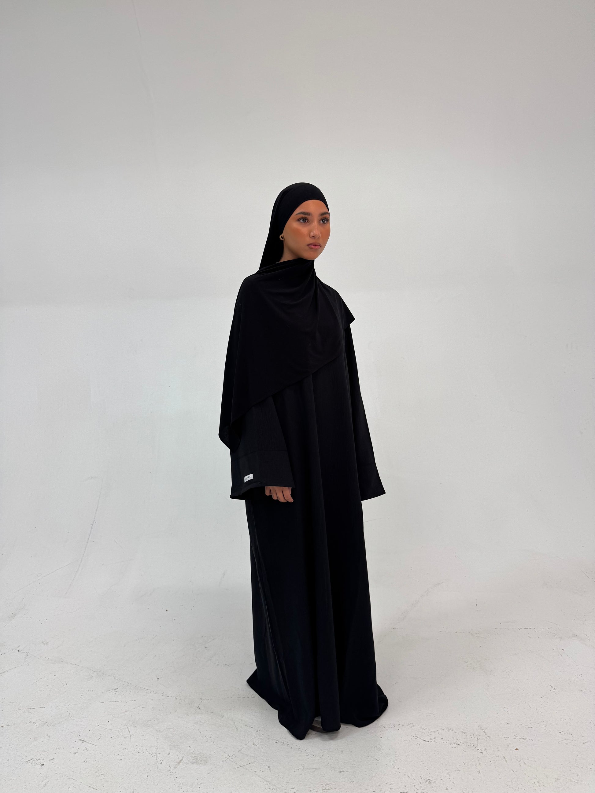 Our abaya made with stretchy jazz fabric, offers both comfort and flexibility. It features convenient pockets and has a unique design with our name on the sleeve, combining practicality with a modern look.