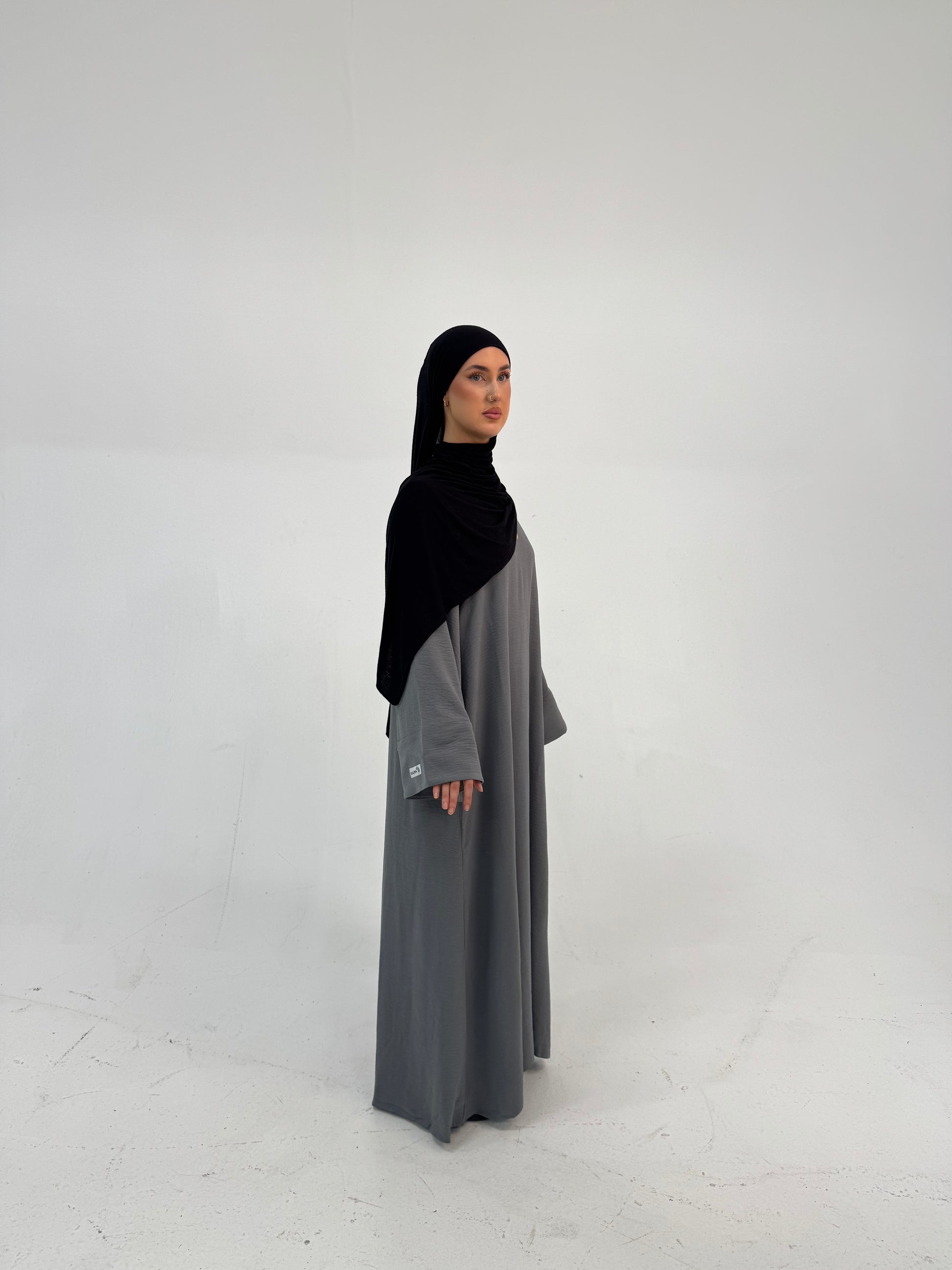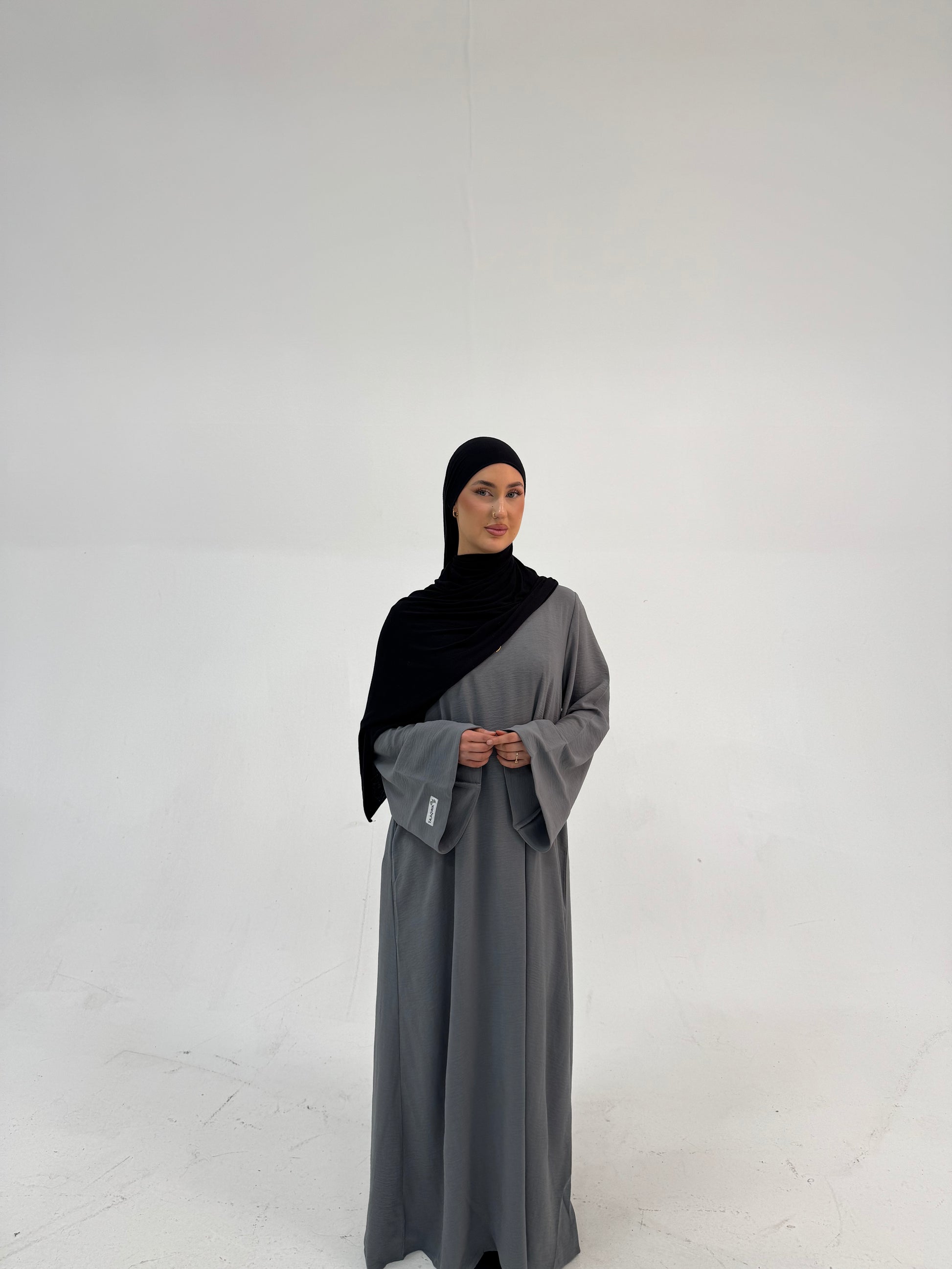 Our abaya made with stretchy jazz fabric, offers both comfort and flexibility. It features convenient pockets and has a unique design with our name on the sleeve, combining practicality with a modern look.